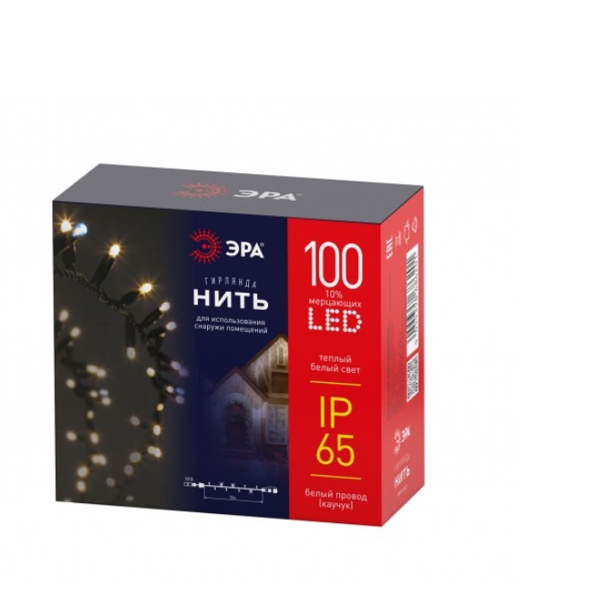 Профессиональная уличная гирлянда Нить длиной 10 метров с теплым белым светом имеет эффект мерцания, создаст праздничную атмосферу на улицах города и во дворе загородного дома. Провода гирлянды изготовлены из мягкого белого каучука высокого класса, который сохраняет свои свойства даже при очень низких температурах и не боится осадков, а светодиоды защищены надежными влагозащитными колпачками. Новогодние гирлянды ЭРА подходят для праздничн