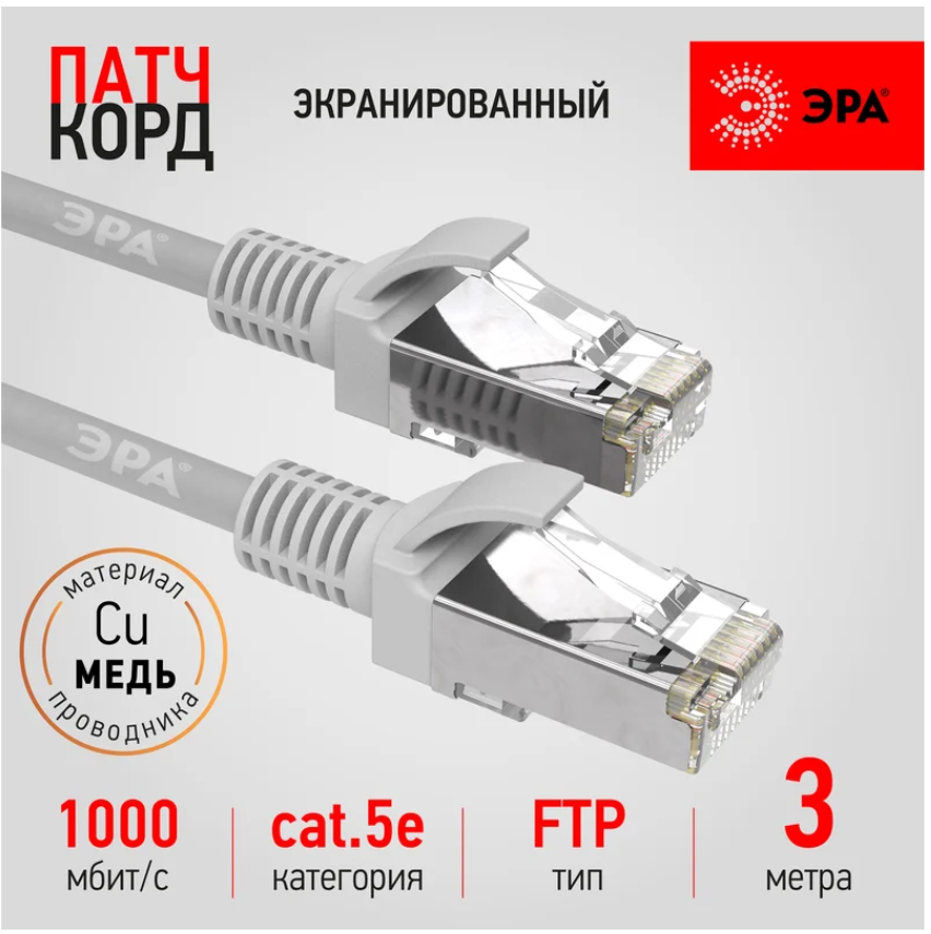 Патч-корд ЭРА PC3F F/UTP категория 5e, длина 3 метра, экранированный, серый, Cu, Б0051347 - соединительный шнур, состоящий из витых пар изолированных проводников и с двух концов обжатого коннекторами. Также его называют коммутационным шнуром. Такие кабели используют в структурированных кабельных системах (СКС) для коммутации устройств, передачи данных между ними.