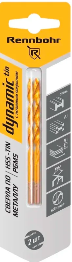 Сверло по металлу RENNBOHR DynamicTin предназначено для обработки легированных и углеродистых сталей, цветных металлов, чугуна, пластмассы.